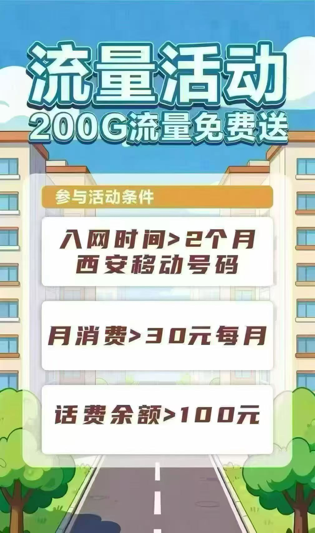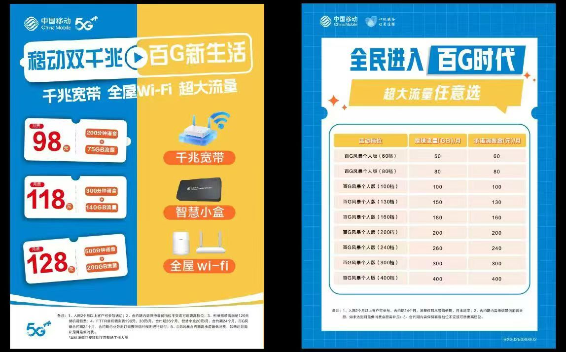 三、西安移动单宽带 680元包年 (不绑卡 不绑号 纯宽带) 四、西安移动老卡用户:多卡抵消38元,200M宽带免费送(特批套餐,随时停办) [西安移动宽带58元套餐] :300M光纤 宽带+机顶盒20元/月+手机卡套餐(200分钟通话,全国流量5GB) [西安移动宽带98元套餐] :300M光纤 宽带+机顶盒20元/月+手机卡套餐(300分钟通话,全国流量20GB) 新版卡用户首年7折优惠 [西安移动128元套餐] :500M光纤 宽带+机顶盒20元/月+手机卡套餐(500分钟通话,全国流量30GB)新版卡用户首年7折优惠 [西安移动158元套餐] :500M光纤 宽带+机顶盒20元/月+手机卡套餐(700分钟通话,全国流量40GB)新版卡用户首年7折优惠 [西安移动198元套餐] :1000M光纤 宽带+机顶盒20元/月+手机卡套餐(1000分钟通话,全国流量60GB)新版卡用户首年7折优惠 温馨提示: 1、光猫和机顶盒公司免费提供,退网需退回设备,合约期限一年内不能拆机退网销户过户等,路由器用户自备; 2、必须有一张西安本地移动手机号码,没有的用户可以预约上门办理一张,预存100元话费即可,不推荐用户自己办卡,一是店面给用户办的卡捆绑太多无法下宽带订单,二是用户自己办理的卡套餐不合适影响装机 移动宽带安装流程: 无卡需要先上门办卡和登记宽带资料,有卡按要求提供资料,我们后台下宽带订单,装机师傅收到宽带订单后跟您约装机时间,然后上门装机。 办理方式: 1、提供小区名称,几号楼,几单元,几层,房间号,姓名,联系电话、西安移动电话及其对应的身份证号码(身份证正反两面照片通过微信发给我) 2、资料提交后,装机师傅一般8小时内完成装机,请保持电话畅通;